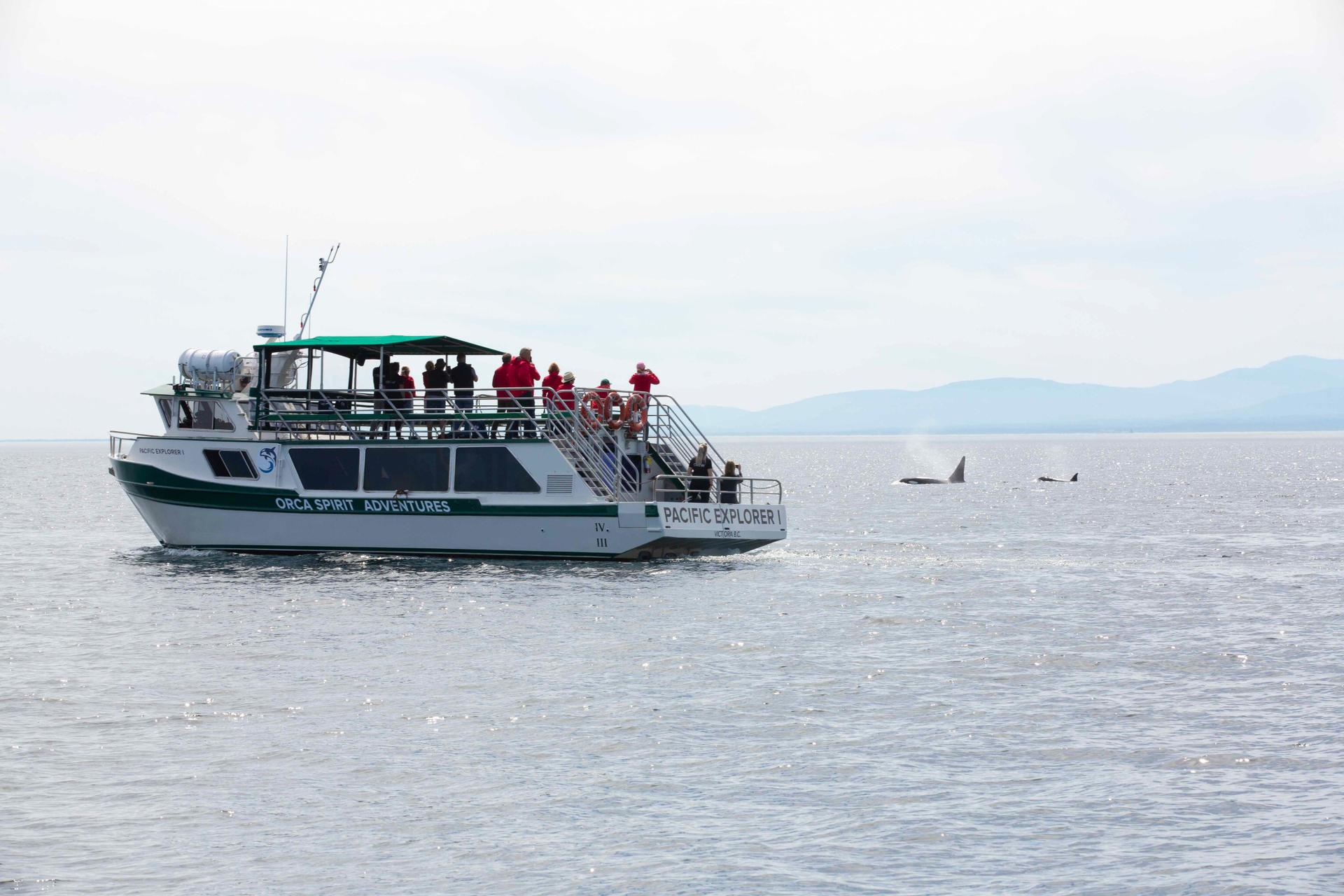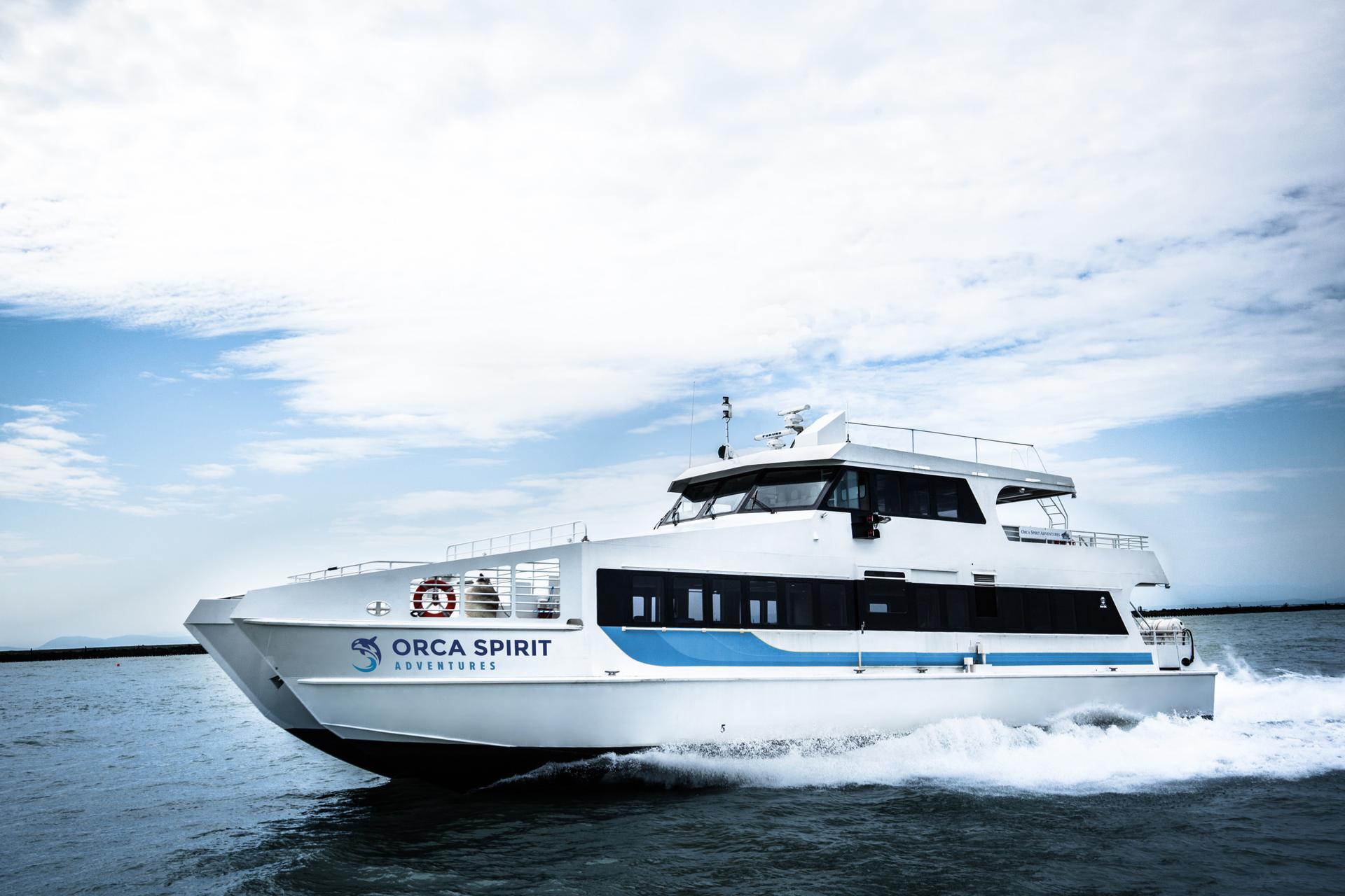 “Orca Spirit II will provide you and your guests with the ultimate in luxury, stability, safety and comfort. With a passenger capacity of 168, this vessel is able to offer a wide variety of tours including: whale watching, dinners, weddings, harbour cruises, special event charters, floating conference venue, marine transportation and endless tour options. The Orca Spirit II is available for charters departing out of Victoria or Vancouver harbours. Cruising at 25 knots, the sky is the limit for this luxury catamaran. The vessel is equipped with large outdoor viewing decks, 2 levels of spacious heated cabin areas, indoor dining, 2 full service bars, dance floor, 2 full washroom facilities and food serving area with storage and galley space. Video monitors and stereo system PA system throughout the vessel are used for special events and narrated wildlife tours. A unique and truly amazing vessel, if you’re considering chartering a vessel for your event why settle for anything less.”
