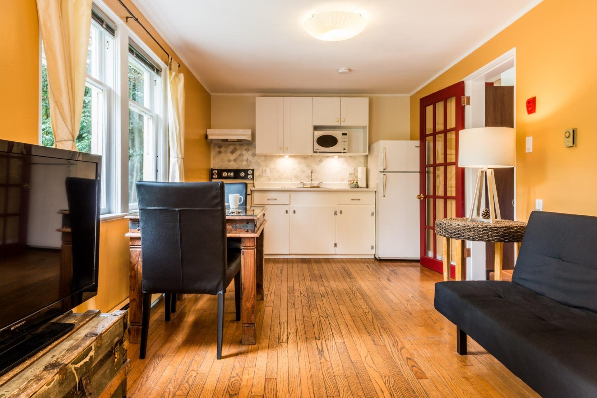 Individually designed and decorated bright character suites in 1907 heritage house at fantastic affordable daily/weekly/monthly rates. In quiet and historic James Bay, one block from Beacon Hill Park, three blocks from ocean bluffs and beaches and five blocks from downtown. Fully-equipped kitchens, queen sized beds and additional pull out beds, spacious back garden and deck with stunning native flowers, TV/DVD, laundry facilities, free parking, free wired and wireless internet. Perfect for a family retreat or romantic getaway!