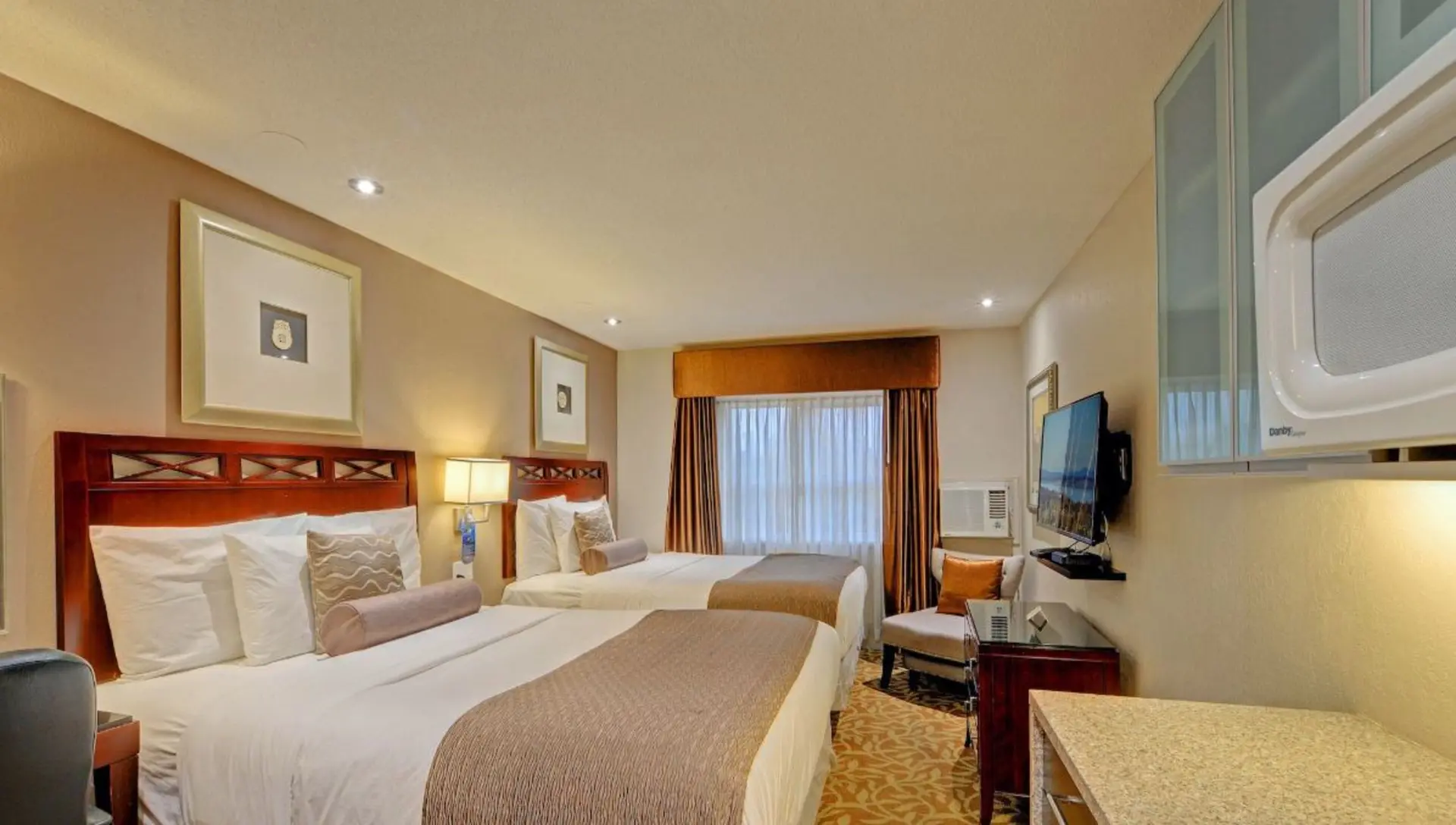 This full facility hotel offers well-equipped rooms, studio suites and one-bedroom suites at the best prices in town. Many modern amenities for guests to enjoy. Free High-Speed internet in every room, kitchenettes, refrigerator, microwave, TV with full cable channels and satellite channels, coffee maker, radio alarm clock, hairdryer and makeup mirror, outdoor heated pool, meeting rooms, full fitness gym access, free guest parking, 24 hour business service and guest laundry. Popular restaurant, Sports lounge/bar and Cold Beer & Wine Store are also on site.