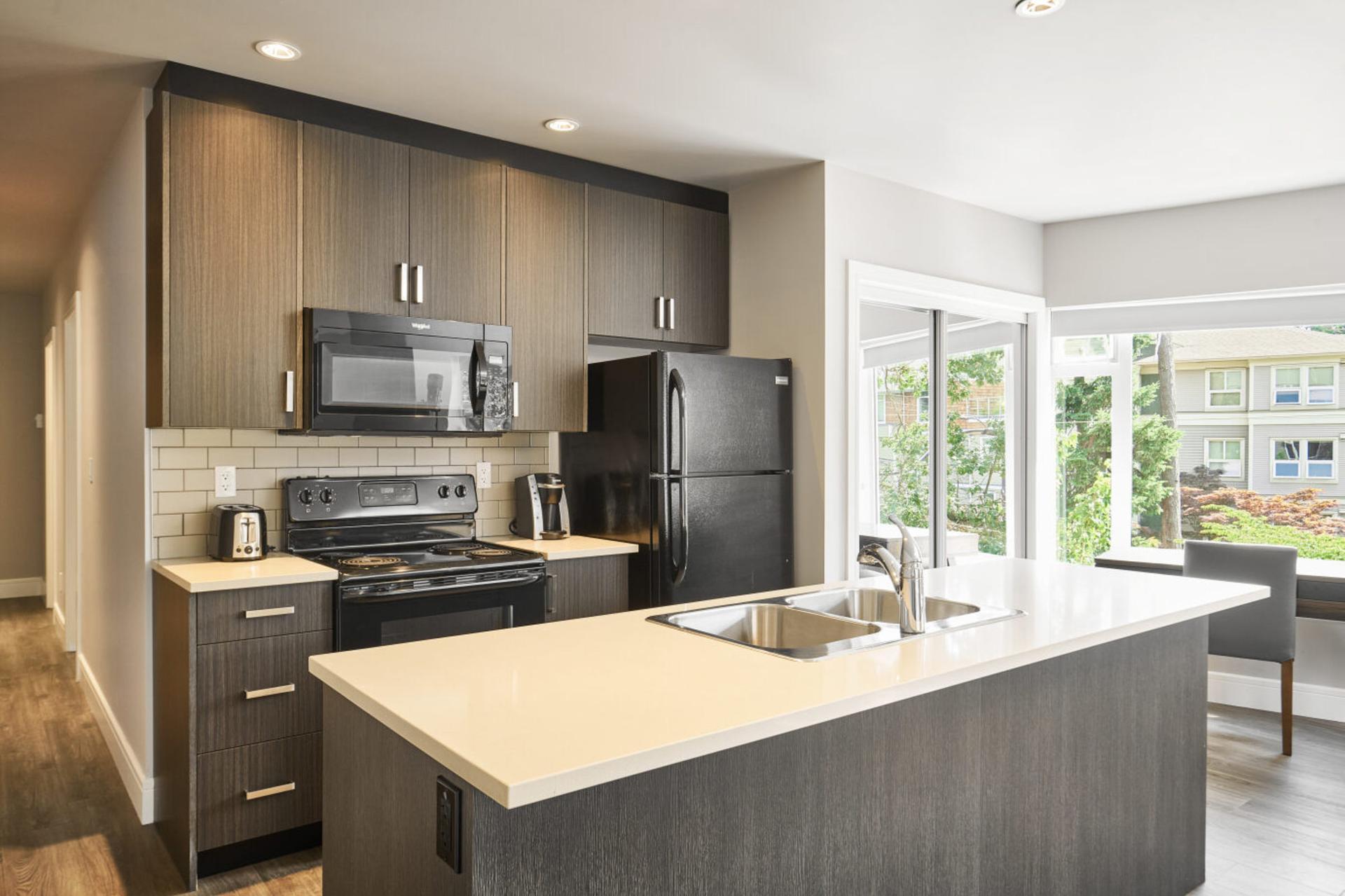 Built in 2018, Victoria BC SoLo Suites is a concreate and steel six story building. Our rooms are condo style and offer all the comforts of home. All our rooms are furnished with a stove a fridge, a dishwasher, a microwave, 4K smart TV, internet for streaming for your accounts and a washer and dryer. Onsite parking is free for all our guests.