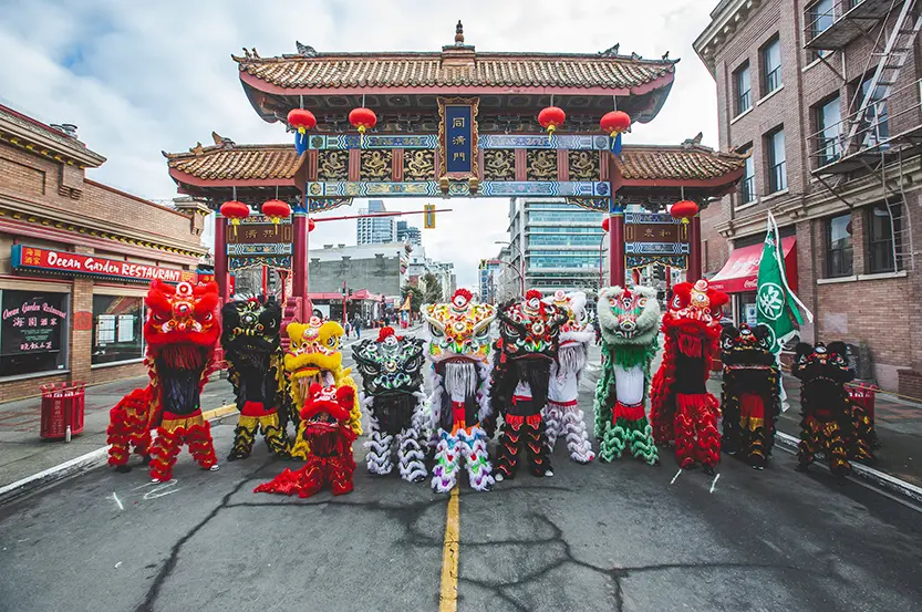 Lions and dragons will parade along the 500 block of Fisgard Street, ending at the Chinese Consolidated Benevolent Association / Chinese Public School (636 Fisgard Street).