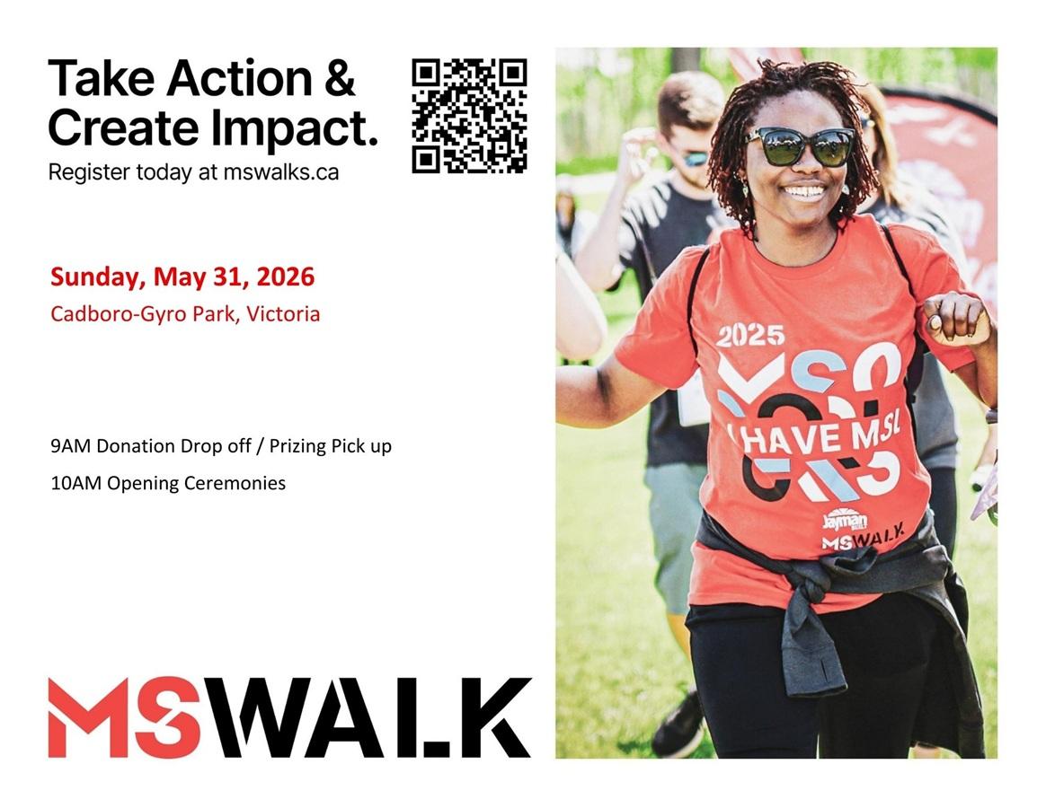 We are so excited to welcome you to the 2026 Victoria MS Walk! Connect with the MS Community on Sunday, May 31, 2026. Join us in-person or walk virtually from wherever you are. Every step fuels awareness, strengthens support networks, and drives research for over 90,000 Canadians affected by MS.
