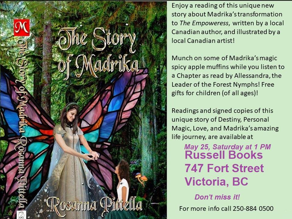 During this event, Avid and New Fans of The Story of Madrika throughout Vancouver Island will have the opportunity to meet Alessandra, the leader of the forest nymphs, in person and enjoy her reading for children of all ages! The local Canadian author will be on hand to answer questions about The Story of Madrika: Lucas’ Tale (Book 2) for all interested. At the reading, we will be giving away FREE delicious spicy apple muffins, FREE GIFTS and FREE Coffee for all that want it! We would love to see you there!