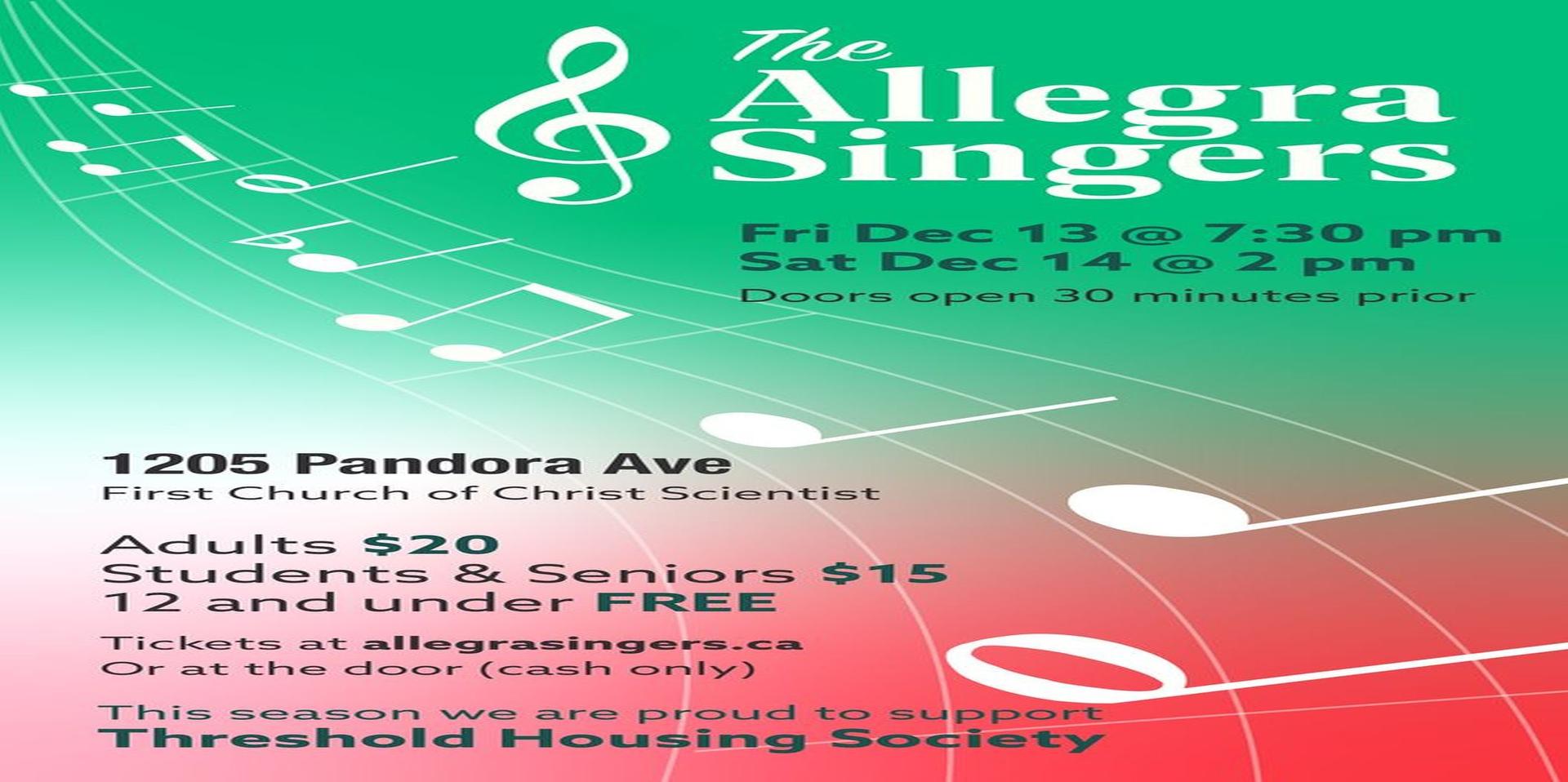 We would love to have you experience the joy of this Allegra Singers Winter tradition. We can’t wait to share this special performance with you—mark your calendars and bring your friends and family for a night or afternoon to remember!