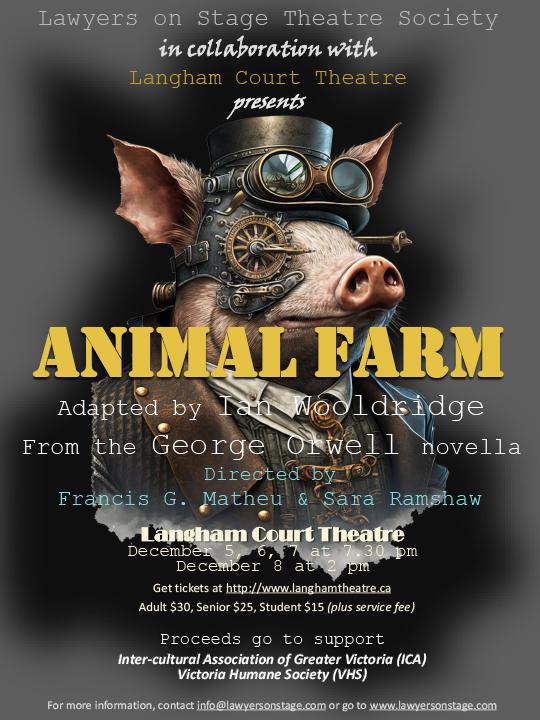 Almost 80 years after its publication, Lawyers on Stage Theatre Society (LOST) will present its 2024 annual fundraiser, George Orwell’s masterpiece Animal Farm, live on stage on December 5, 6, 7, and 8, 2024 at Langham Court Theatre.