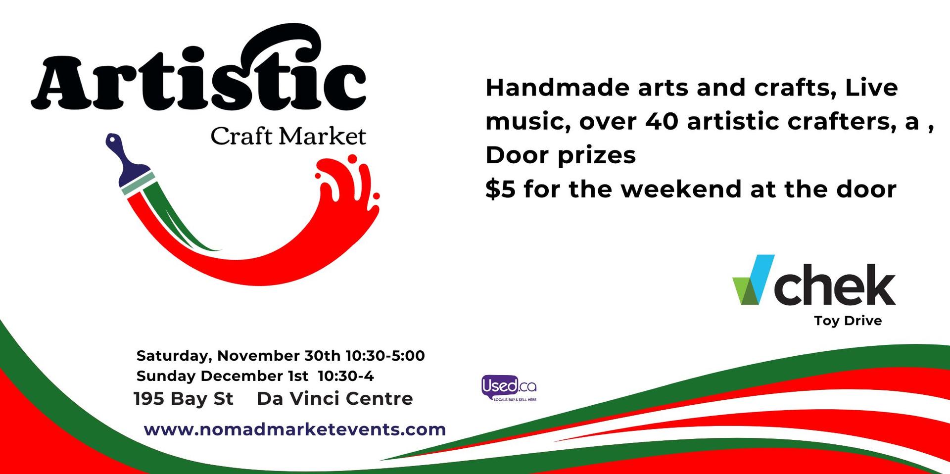 Don’t forget about the upcoming Artistic Craft Market! Join us at Victoria’s Da Vinci Centre for two days of exceptional arts and crafts. With 40 exhibitors, our fair is a must-visit for thousands of visitors. You’ll find an array of artisans showcasing their work, including gourmet food, fine art, photography, clothing, glass art, jewelry, bath and beauty products, wine, spirits, and fine woodwork. Don’t miss out on this incredible event! The weekend pass is $5.00 at the door, with partial proceeds going to the Chek TV Toy Drive.