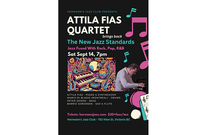 The band will feature drummer Mario Di Blasio visiting from Montreal, as well as great Victoria bassist Peter Dowse, who is also a former Montrealer. Barrie Sorensen of the Naden band will provide his bold sax and flute work. Attila will be playing both the piano and his synthesizer to capture the iconic sounds of the era. The chemistry between these musicians is undeniable and the energy they have on stage is infectious. Come have a fantastic night out at Hermann’s, it’s going to be an enjoyable ride!