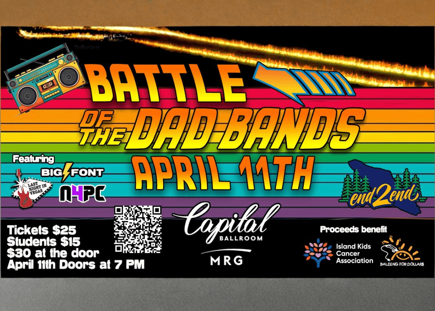 Get ready to turn up the party at this year’s Battle of the Dad Bands – a no-holds-barred rock showdown where weekend warriors become self-proclaimed virtuosos. Multiple dad-powered bands hit the stage bringing big riffs, driving beats, and the kind of music that reminds you why live rock and roll never gets old. Bragging rights are on the line, the volume is cranked to 11, and the energy is unstoppable. Come cheer, rock out, and help crown the ultimate dad band while raising money in support of the Island Kids Cancer Association and Balding for Dollars. This is not a bedtime show – this is rock and roll!