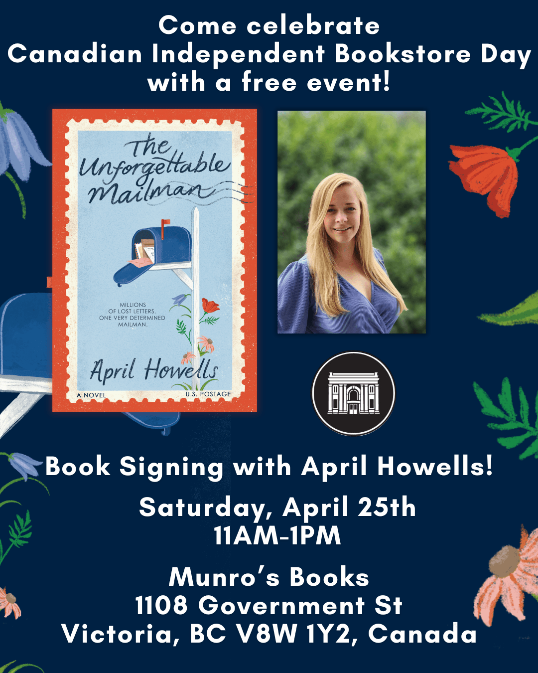 As part of our Canadian Independent Bookstore Day celebrations, we are thrilled to be hosting author April Howells for a book signing at Munro’s Books! Come join the party, meet April in person, and get your signed copy of her debut novel, “The Unforgettable Mailman”.