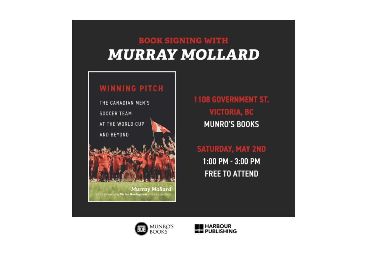 Come by Munro’s to meet author and champion soccer player, Murray Mollard! His newly released book, “Winning Pitch”, is now available to purchase, so come get your copy signed.