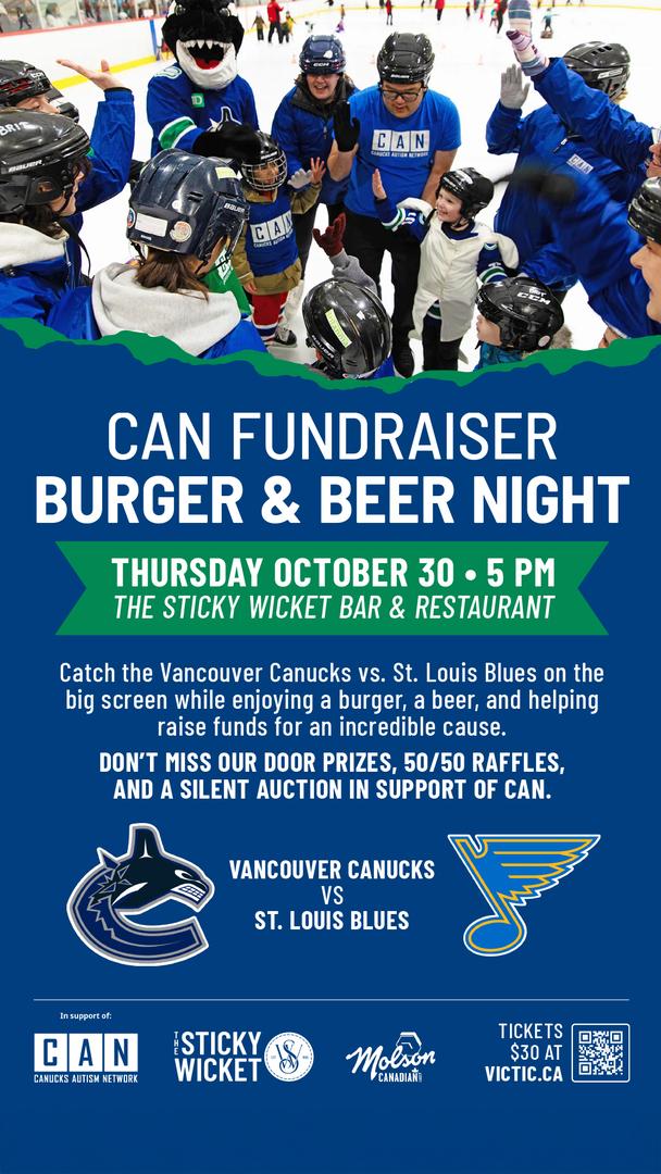 Join us for a night of hockey, community, and giving back! Watch the Vancouver Canucks take on the St. Louis Blues on the big screen while enjoying a classic combo – a burger and a beer – all in support of the Canucks Autism Network (CAN).