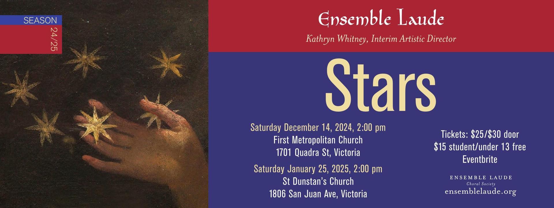 Stars takes the listener on a journey through the ages with the clear tones of medieval Marian music by Hildegard von Bingen, de Chancelier, and others honouring Maris Stella, the Star of the Sea. We sing pieces that tell of the human experience of winter including Anung (Star Child) by Cree composer Andrew Balfour, the transcendent Northern Lights by Ola Gjeilo, electrifying Pakkanen by Soila Sariola, and sparkling Aurora by Victoria composer Nicholas Fairbank. Stars ends with the shimmering Snow Angel by beloved Canadian composer Sarah Quartel.