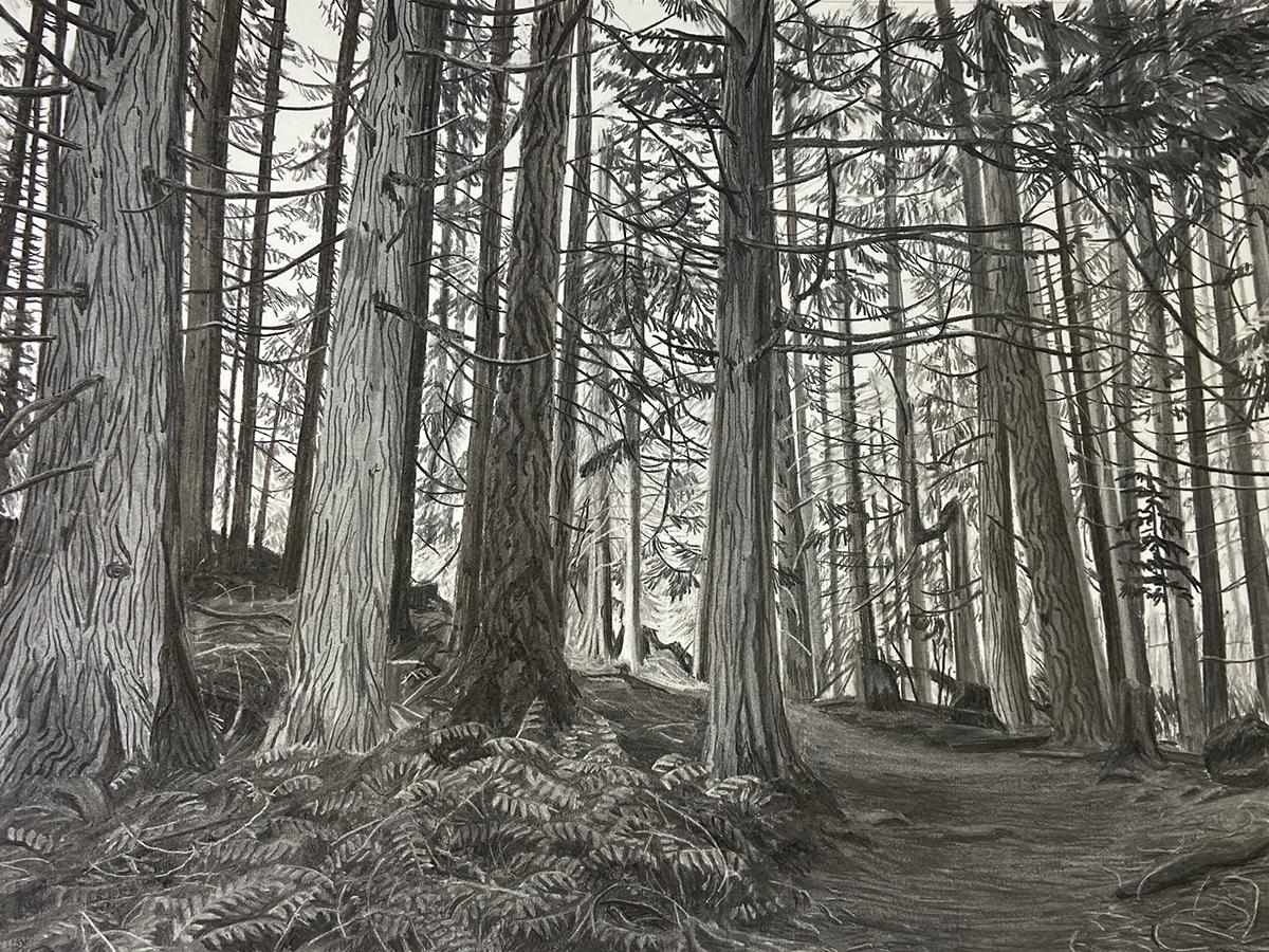 Fermata is a musical term meaning a pause of unspecified length. For Liz, who sings with the choir Ensemble Laude, a walk in the woods or along a beach can deliver a visual fermata, caused by light glancing through the trees or bouncing off the water. Her large-scale charcoal drawings of forest walks, ocean waves, and views from the ferry capture these moments, preserving them in the dreamy stillness of soft monochrome.