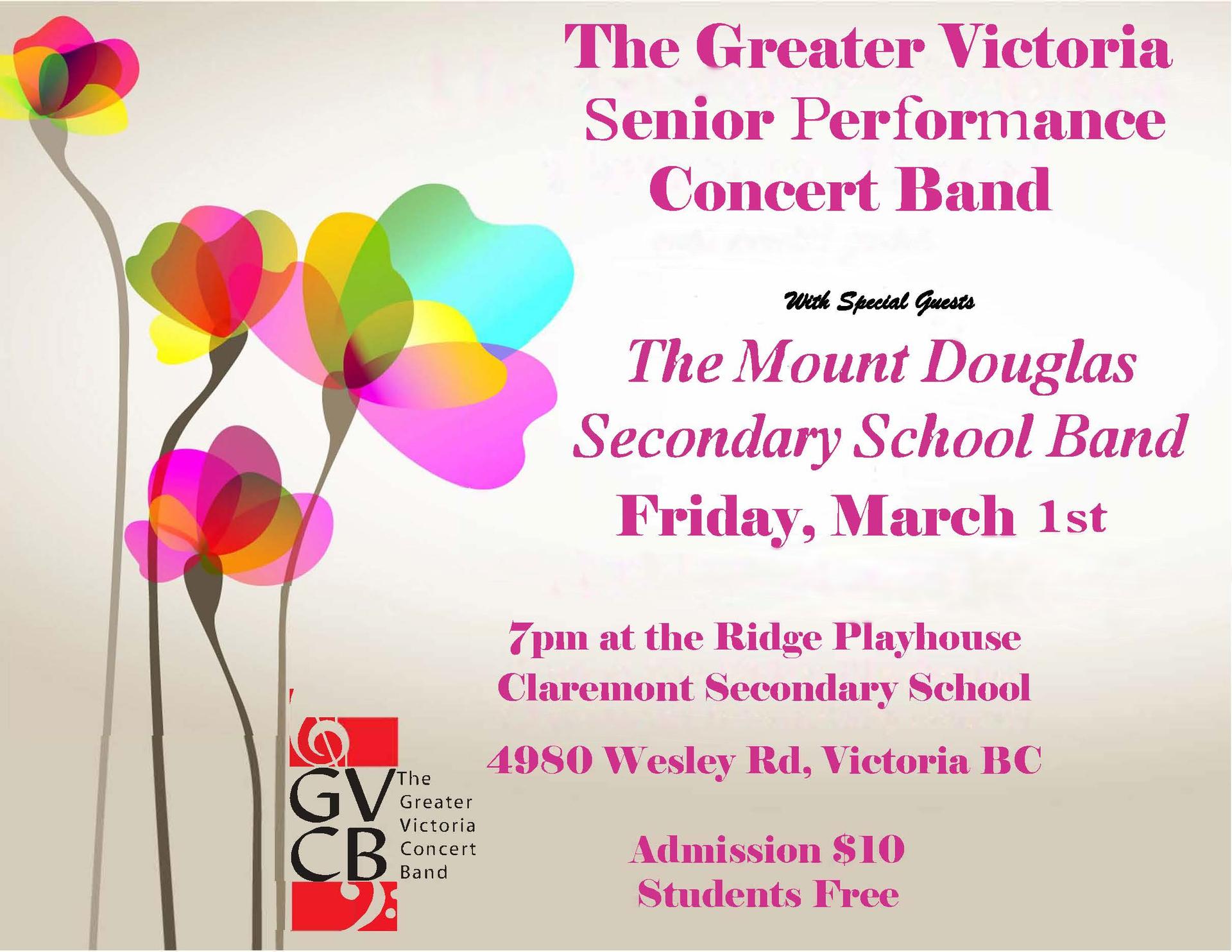 Join us for our upcoming concert with Senior Greater Victoria Concert Band featuring the Mount Douglas Secondary School Band on Friday, March 1st, 7pm at the Ridge Playhouse Claremont Secondary School (4980 Wesley Rd, Victoria, BC). Support community music making, admission is $10, free for students! Bring your family and friends in for a musical Friday night!!
