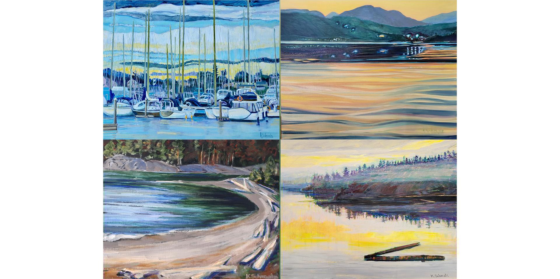 For the month of September 2024, the beautiful artwork of Kathleen Schmalz on the gallery wall in the Inn at Laurel Point.