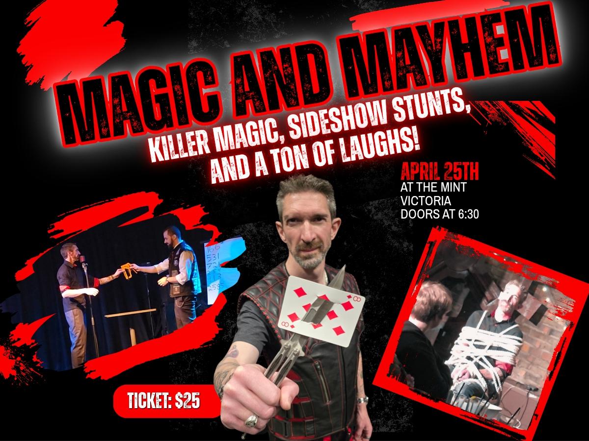 Magic And Mayhem fills the stage at The Mint, downtown Victoria April 25th! Hosted by Tarquin: Sideshow Stuntman, the show brings a unique night of unique magic, jaw-dropping stunts, and big laughs! Magic And Mayhem is the show that combines incredible illusion and sideshow stunts in an unforgettable, high-energy night of real laughs! Grab your tickets at www.SideshowStuntman.com