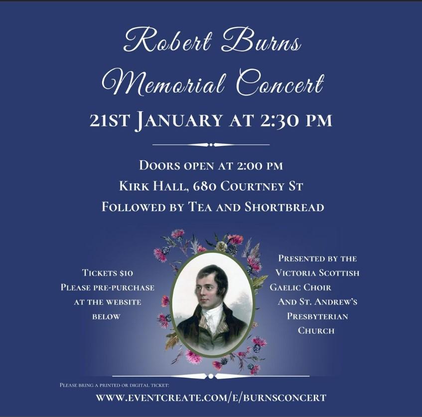 The Victoria Scottish Gaelic Choir and St. Andrew’s Presbyterian Church present the Robert Burns Memorial Concert. Please join us in celebrating the life and work of Robert Burns with an afternoon of music and poetry, Scottish dancing, and more. There will be tea and shortbread to follow the performance.