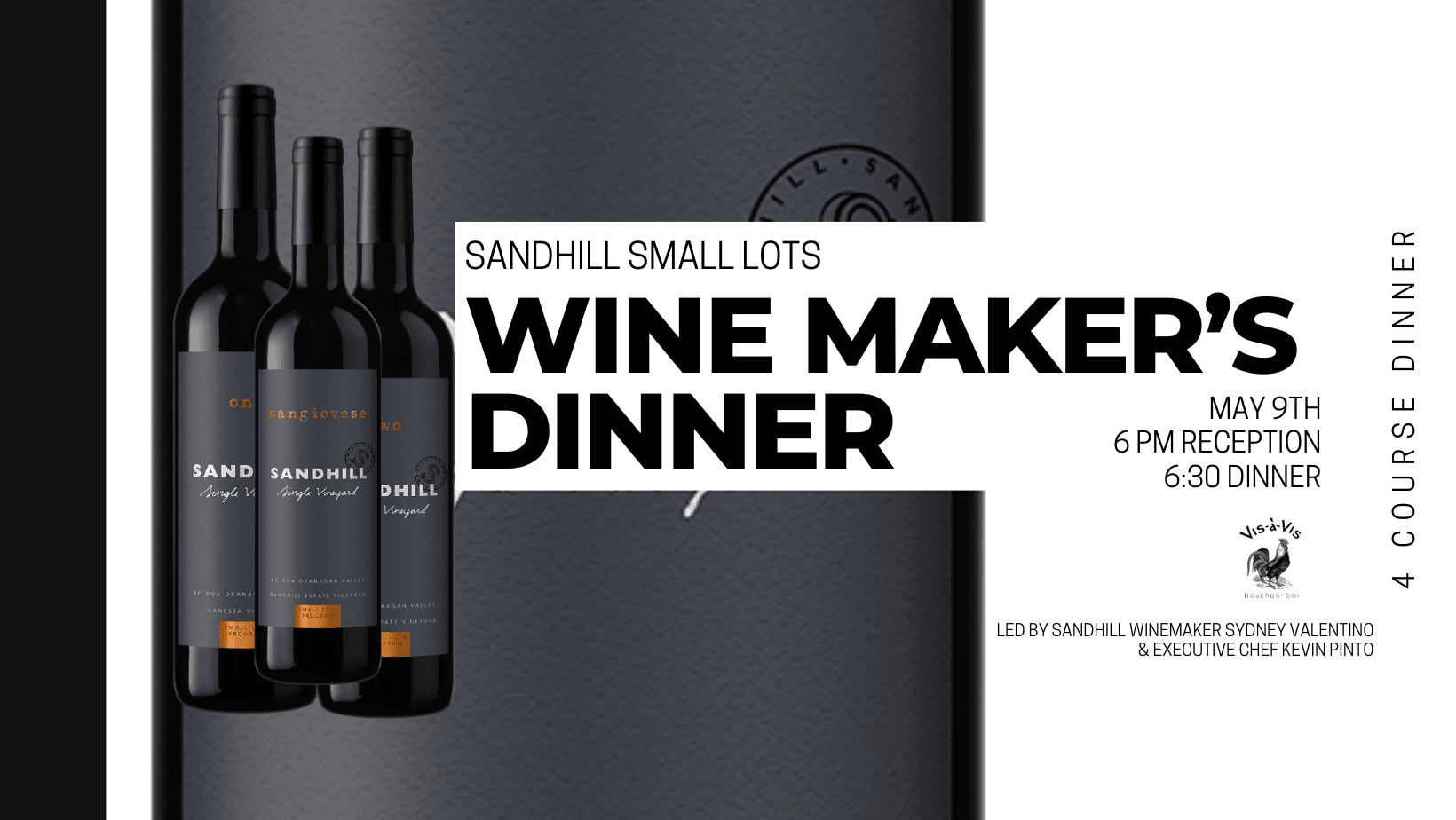 A fantastic four course dinner with pairings from Sandhill winery. Sandhill winemaker Sydney Valentino collaborates with Vis A Vis executive chef Kevin Pinto to bring this culinary event to Oak Bay.