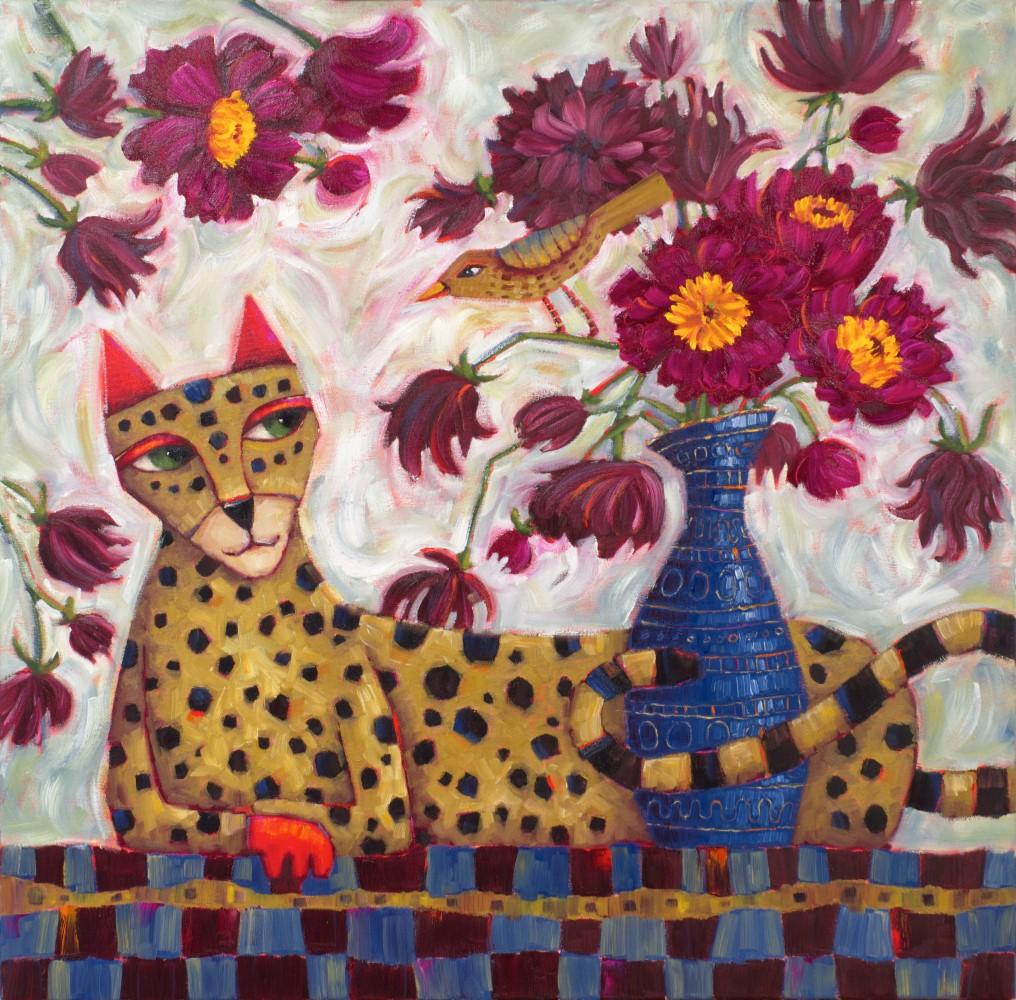 Cindy Revell’s imagination and a background in graphic design led her to illustrate children’s books and magazines throughout North America. Exploration brought her to the fine art she creates today where her creativity spills onto her oil paintings. Flowers, creatures and pattern come together in an exuberant mix to create the vibrant worlds her characters live in. A menagerie of colourful creatures not usually found together converges in her paintings, suggesting the interconnectedness of all things. Even the flowers seem to nod to one another in recognition within her vibrant compositions.