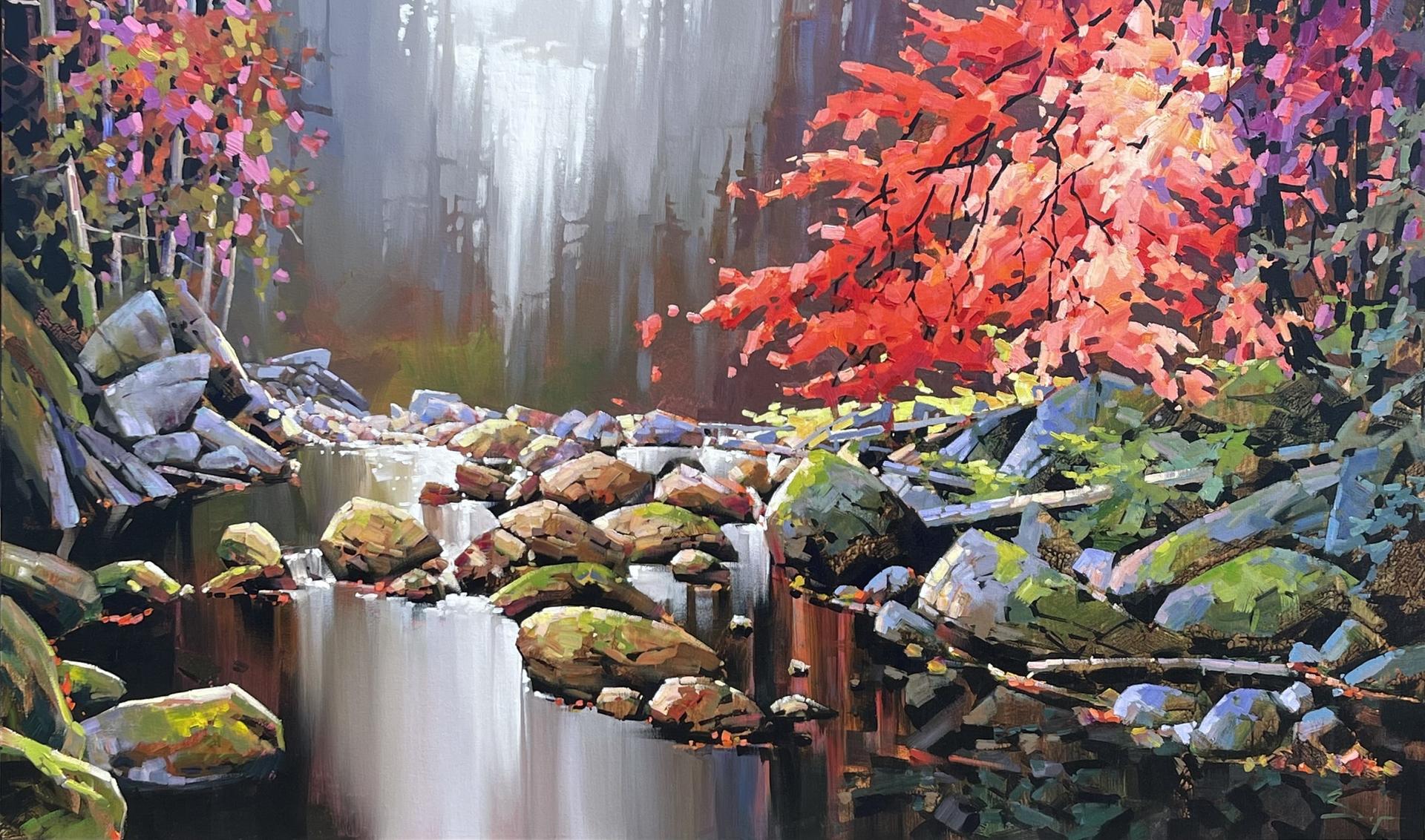 Image: ‘Autumn Scenery in the Valley’ by Bi Yuan Cheng – acrylic on canvas, 36 x 60 inches