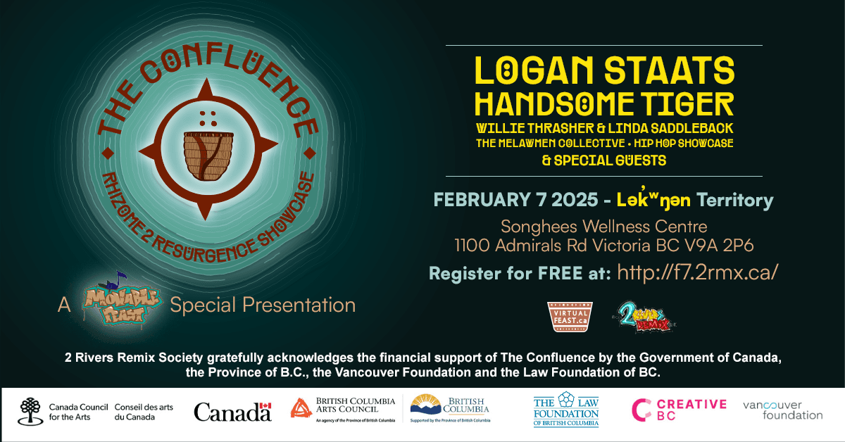 Lək̓ʷəŋən (Victoria, BC), 2 Rivers Remix Society (2RMX), VirtualFeast.ca and Songhees Wellness Centre are proud to announce their collaboration for the upcoming ‘Confluence: Rhizome 2 Resurgence’ showcase.