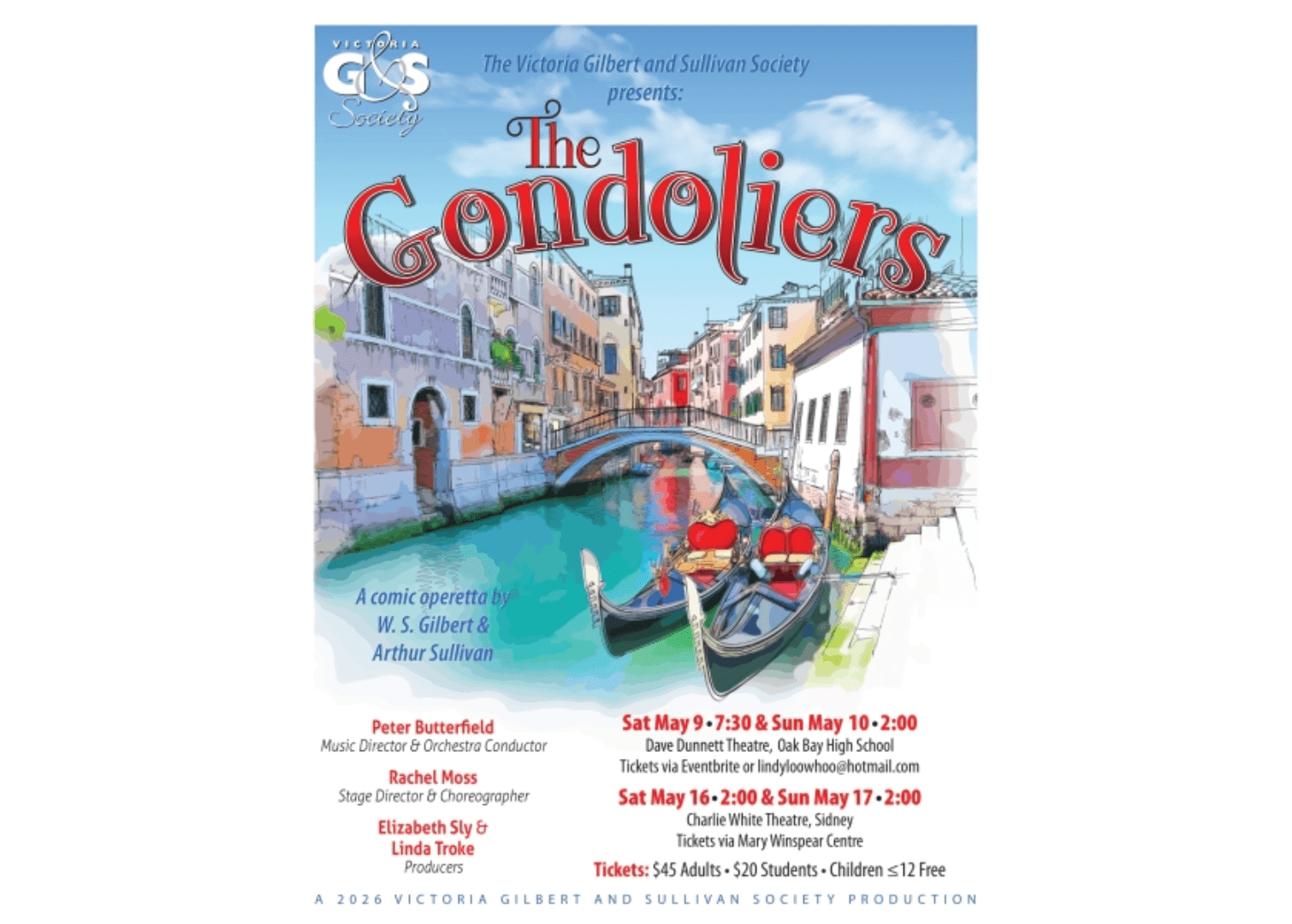 Join us for a fun-filled evening of music, laughter, and romance with The Gondoliers presented by the Victoria Gilbert and Sullivan Society! May 9 @ 7:30 PM May 10, 16, 17 @ 2:00 PM