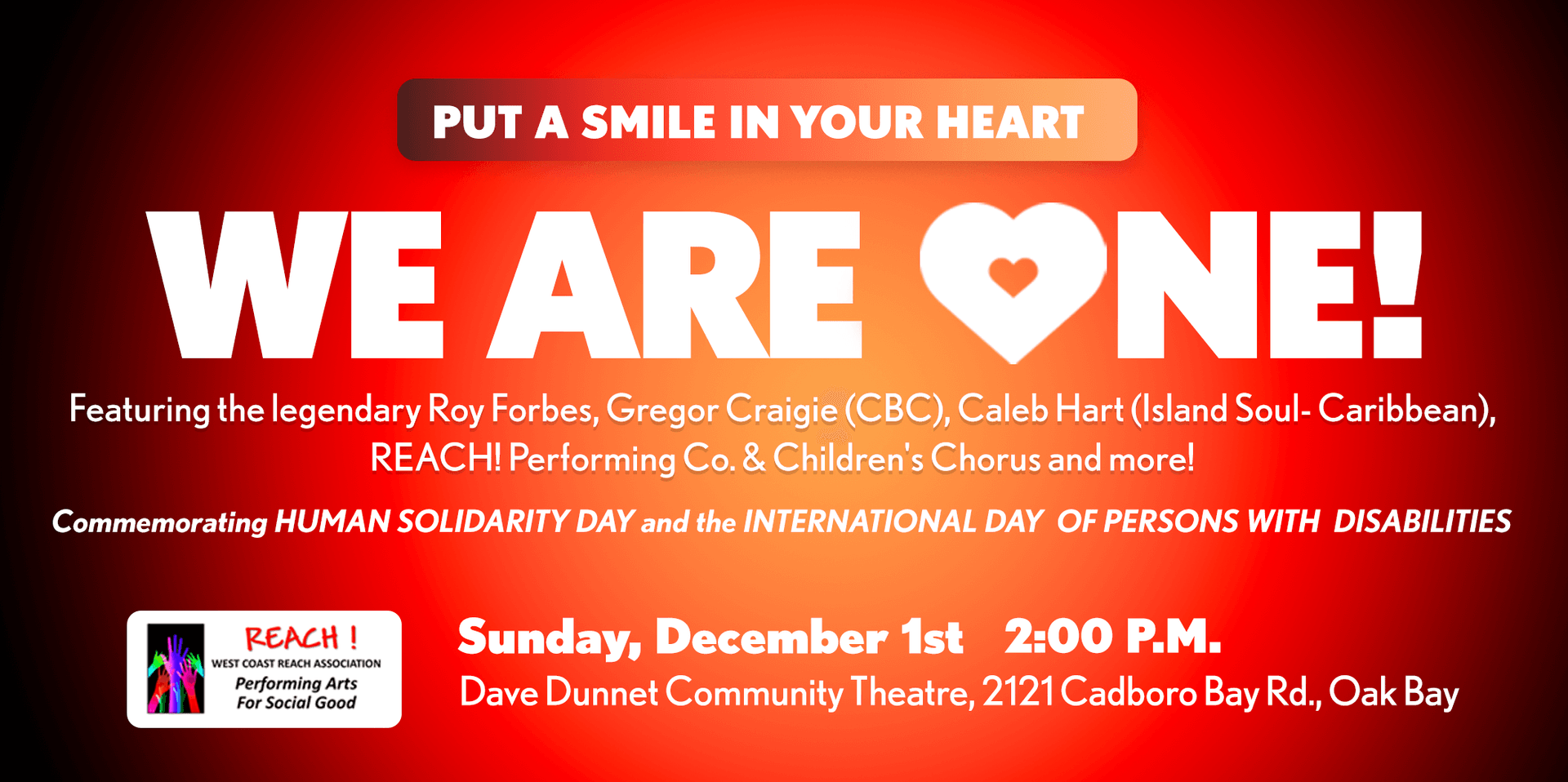 Join us on Sunday, December 1st, at 2:00 p.m. at the Dave Dunnet Community Theatre in Oak Bay for WE ARE ONE! — an inspiring concert celebrating Human Solidarity Day and the International Day of Persons with Disabilities. Enjoy live performances by the legendary Roy Forbes, Caribbean artist Caleb Hart, and the REACH! Diverse-Ability Performing Co. and Children’s Chorus. Hosted by CBC’s Gregor Craigie, this event promises unforgettable music, unity, and joy.