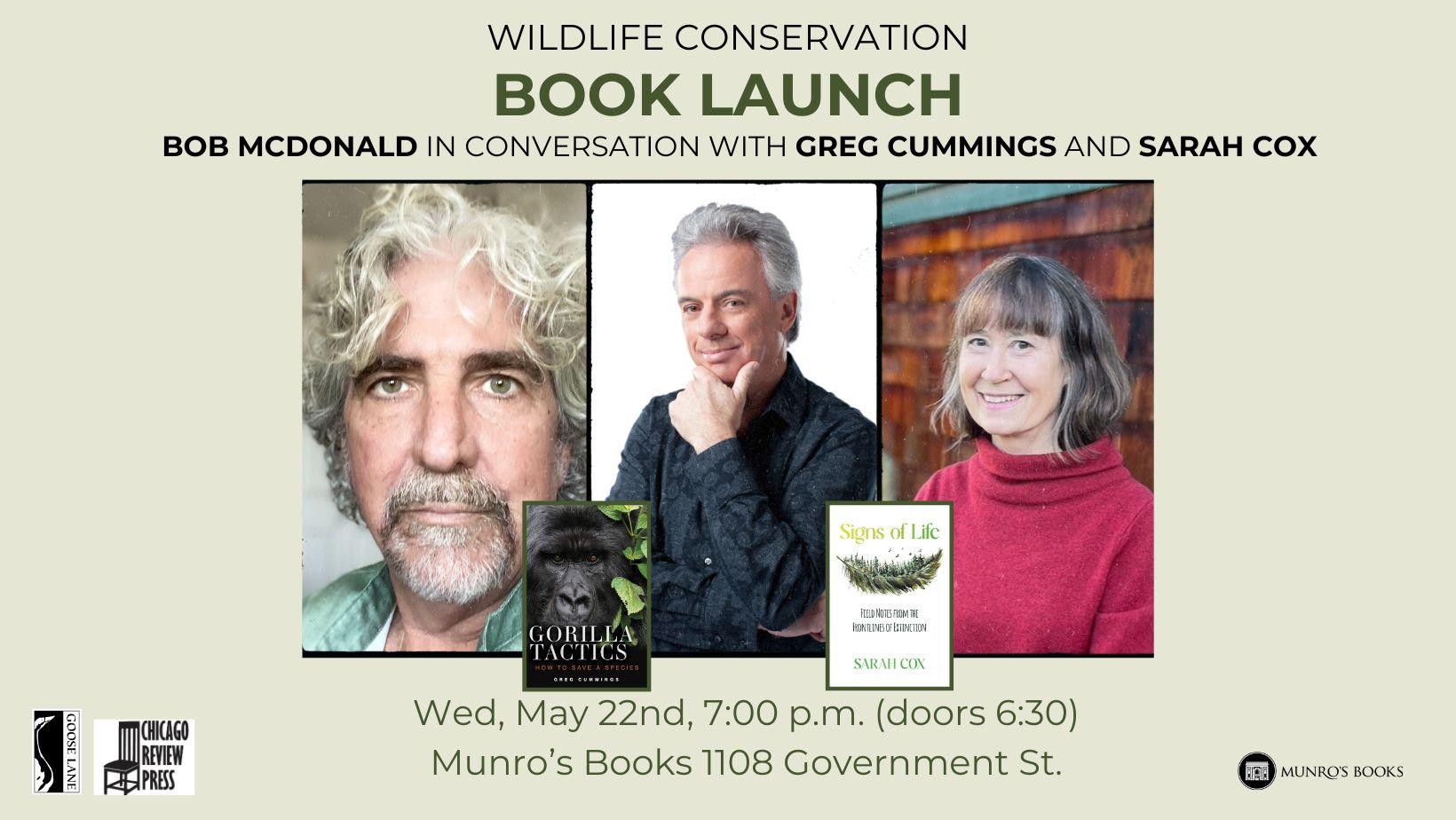 Please join Munro’s Books in launching two new books by local authors about wildlife conversation!! We’ll present Greg Cummings, author of Gorilla Tactics: How to Save a Species and Sarah Cox, author of Signs of Life: Fieldnotes From the Frontlines of Extinction in conversation with Bob McDonald, author of The Future is Now: Solving the Climate Crisis with Today’s Technologies, and host of CBC Radio’s Quirks and Quarks!
