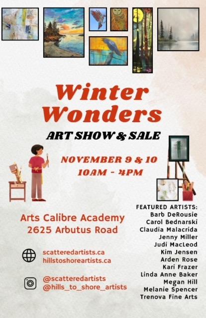 Saanich Artists have come together for the weekend of Nov 9 & 10 for the WINTER WONDERS Art Show & Sale, taking place on Nov 9 & 10, from 11to 4pm. The public is invited to come and enjoy a variety of art forms including Fine Art, Art Prints, Fabric Art, Jewelry, Art Cards and unique artisan gifts. If you are looking for that extra special Christmas Gift you’re sure to find it here.