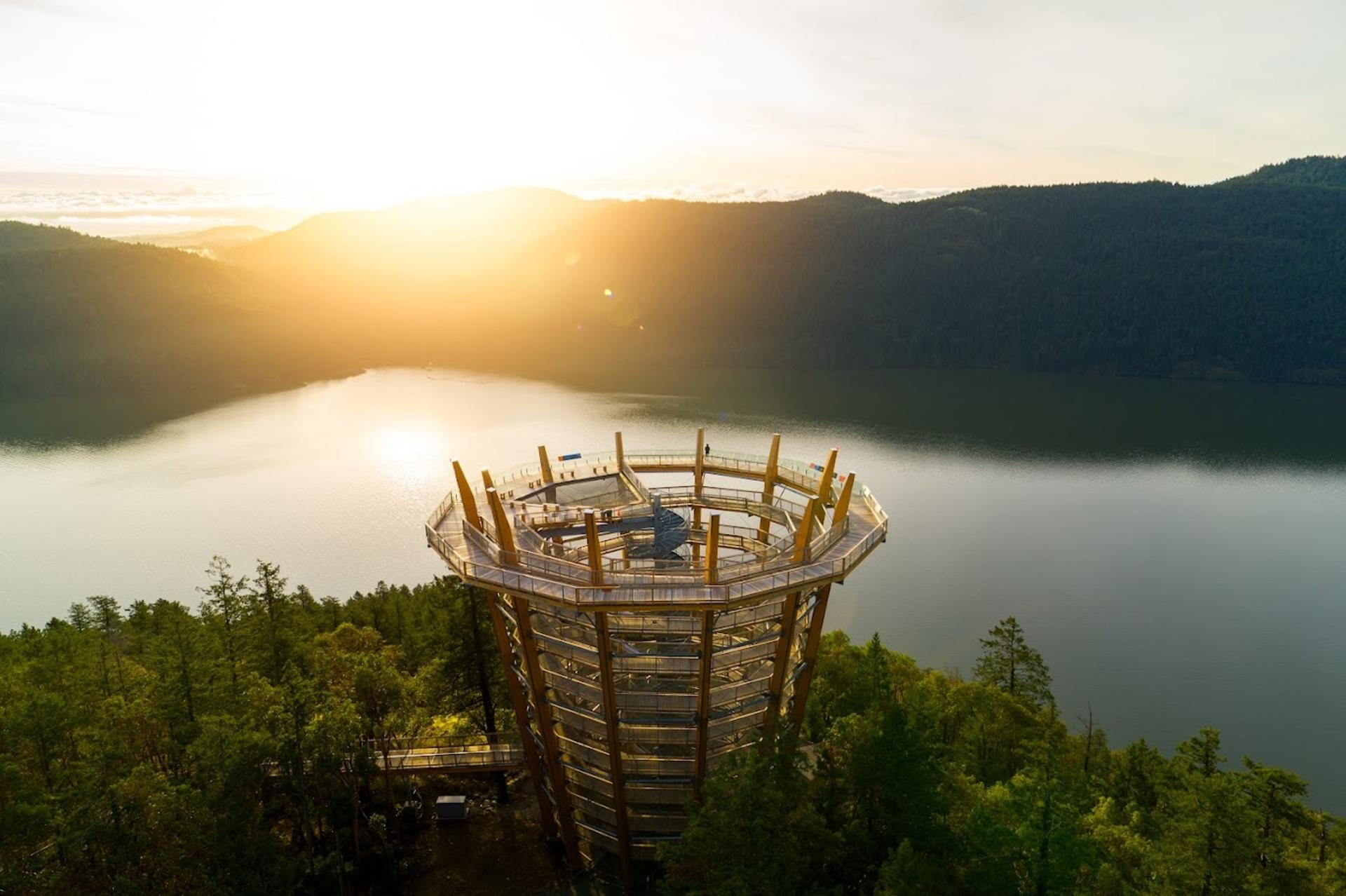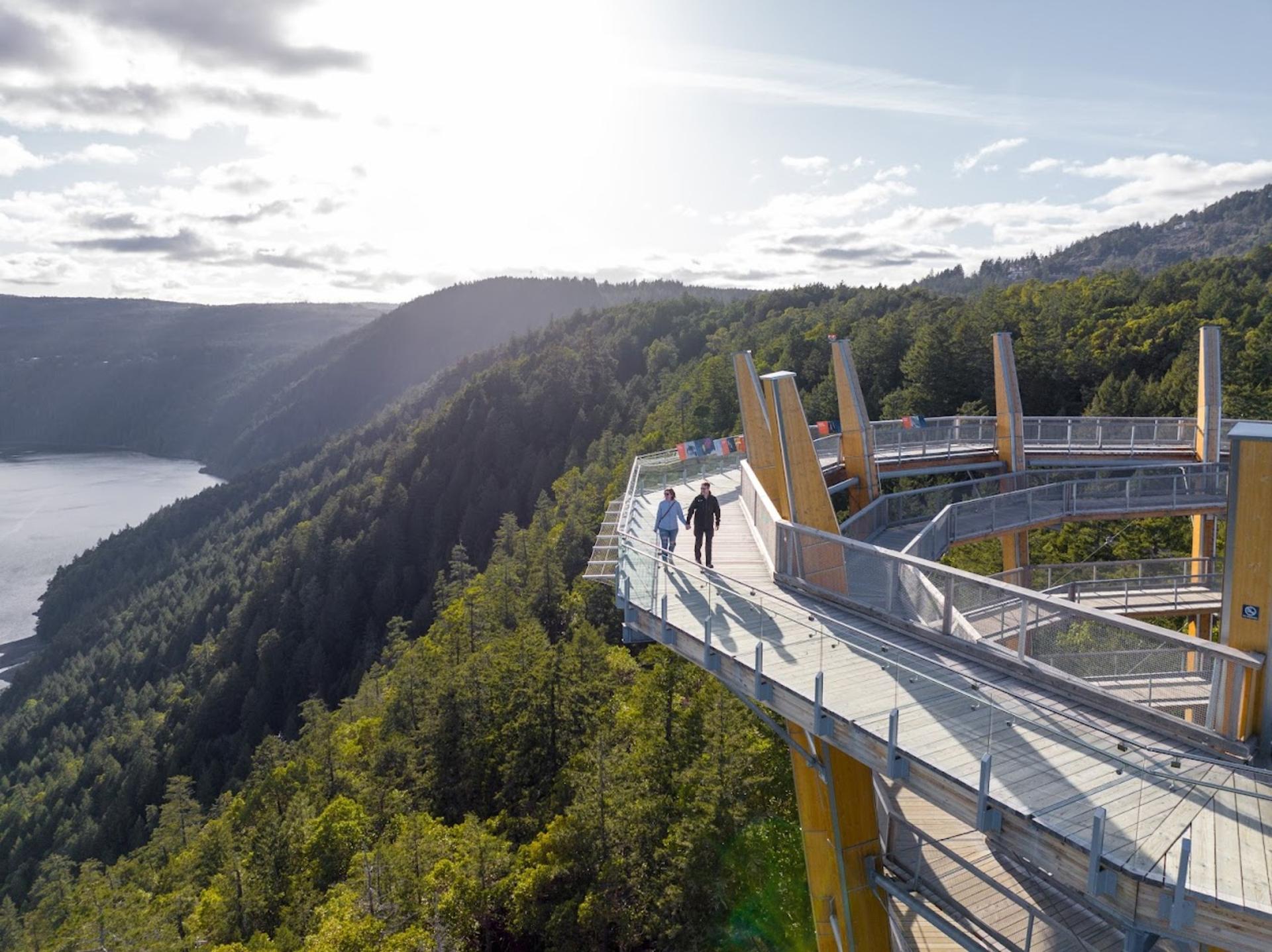 Malahat SkyWalk is an accessible 600m TreeWalk through a beautiful arbutus forest leading to a spectacular gentle spiral ramp that takes up to 32m to a sightseeing lookout offering views of Finlayson Arm, Saanich Peninsula, Mount Baker and the distant Coastal Mountains.