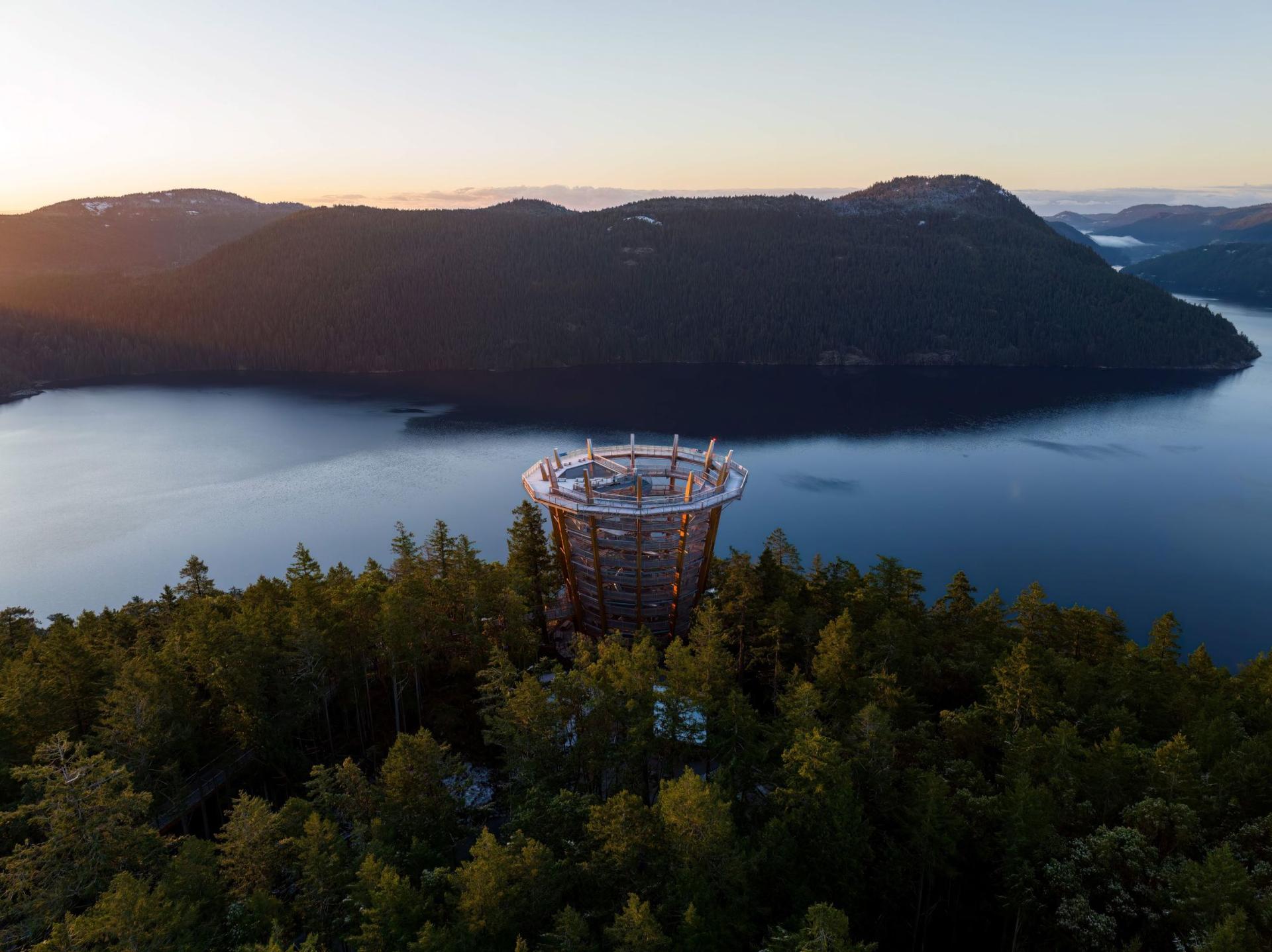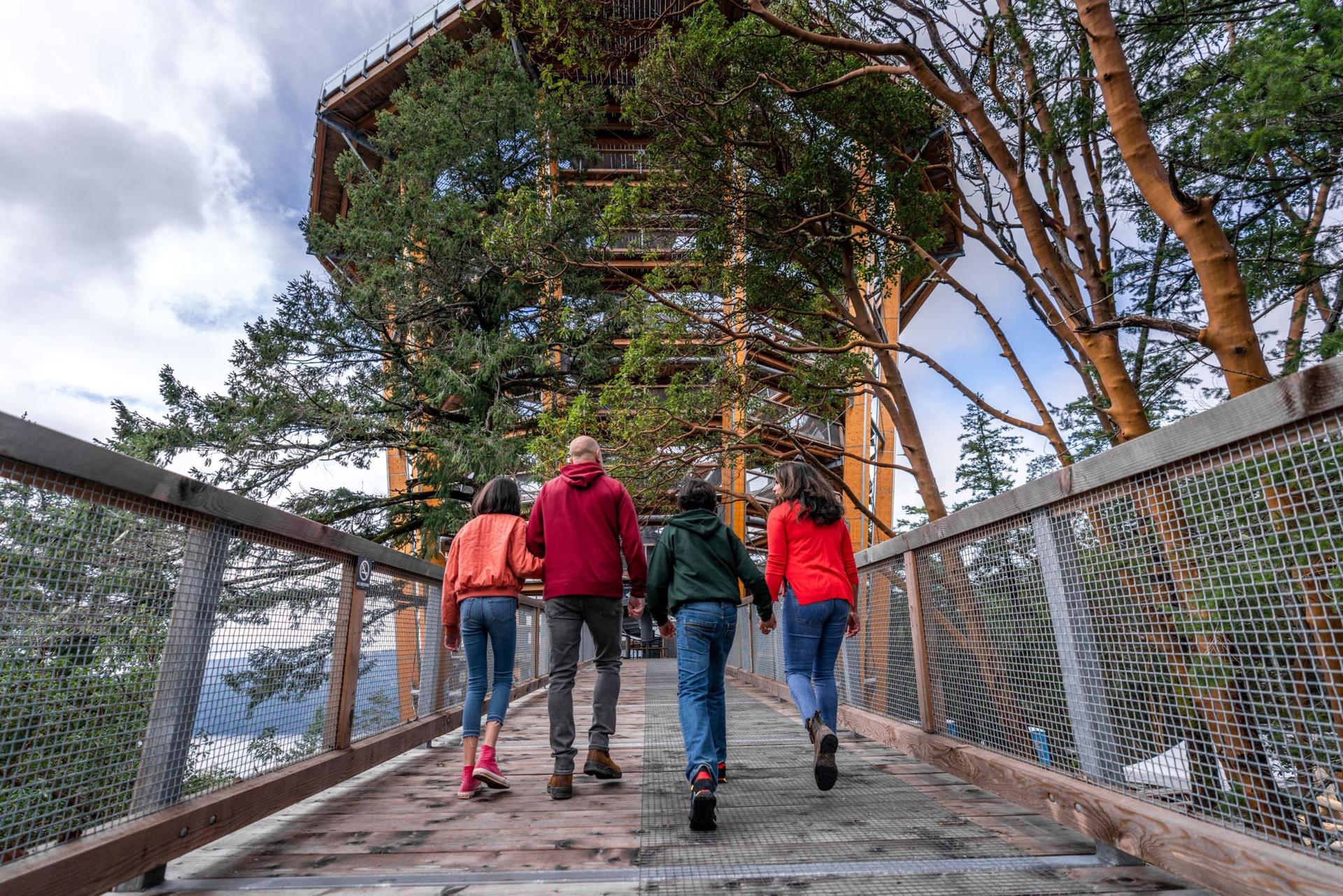 Malahat SkyWalk is an accessible 600 m TreeWalk through a beautiful arbutus forest leading to a spectacular gentle spiral ramp that takes you up 32m to a sightseeing lookout offering views of Finlayson Arm, Saanich Peninsula, Mount Baker and the distant Coast Mountains.