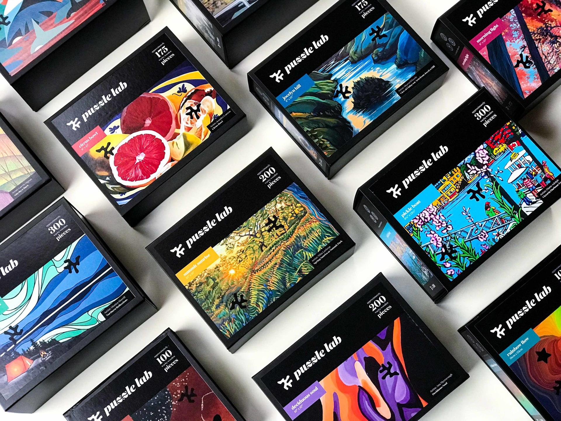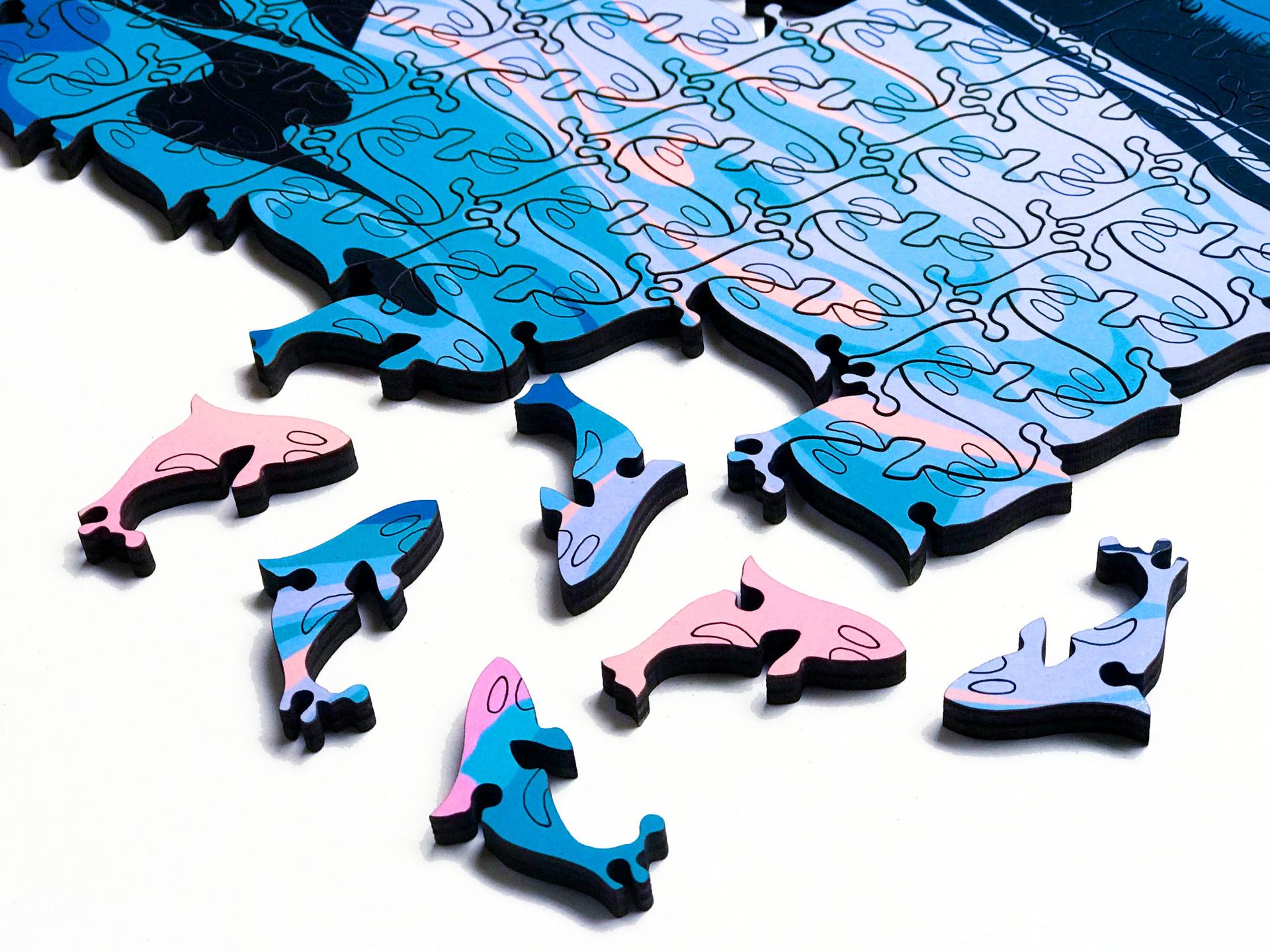 Permission to be Puzzled! A brand new, first-of-its-kind puzzle gallery & shop carrying locally crafted, heirloom-quality wooden jigsaw puzzles like you’ve never seen before. All of our beautiful contemporary artwork is curated from talented up-and-coming Canadian artists who receive a royalty on every puzzle sold. Our signature wacky piece shapes are created using an innovative proprietary algorithm that mimics the growth pattern of coral reefs, and makes for an entirely different puzzling experience when compared with a traditional square-cut jigsaw; perfect for new and experienced puzzlers alike.