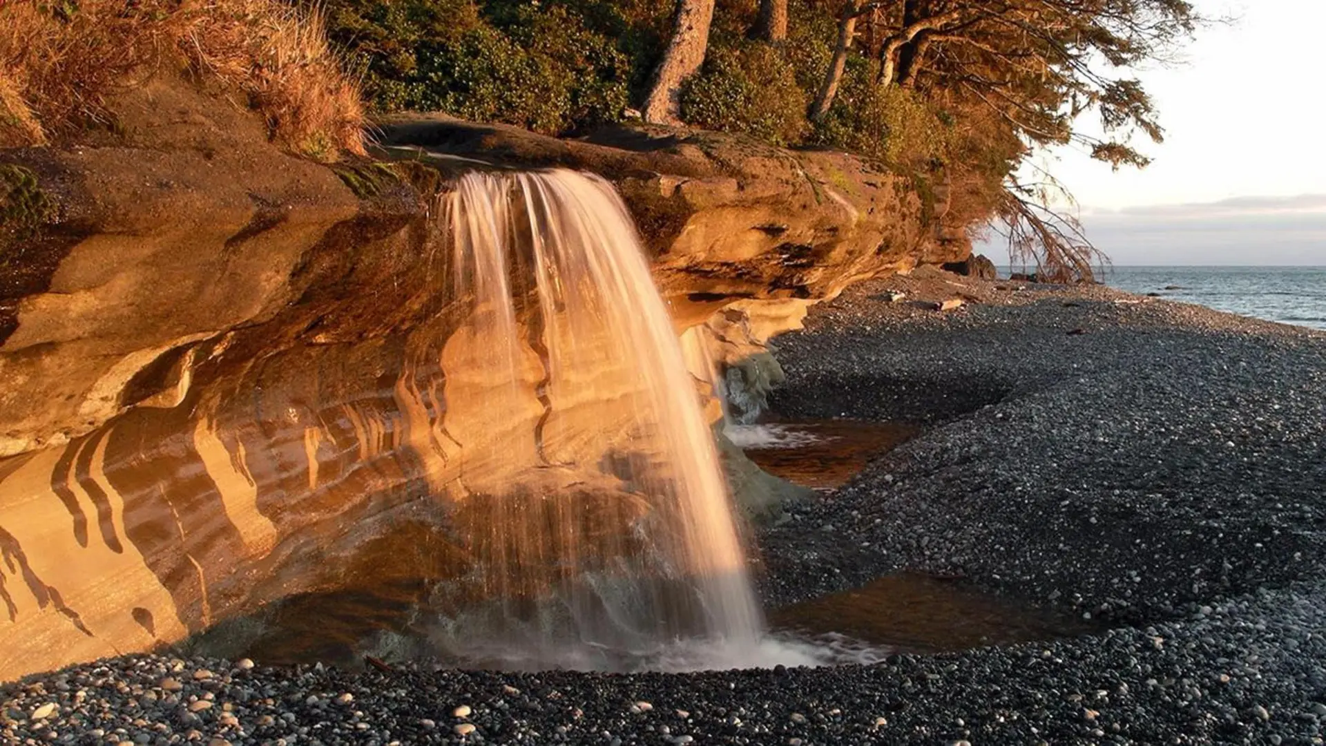 A short walk through the forest, along a trail, boardwalk and down a set of stairs leads to Sandcut Beach, a long cobble shore along the Juan de Fuca Strait. This day-use area is a longtime favourite of locals.