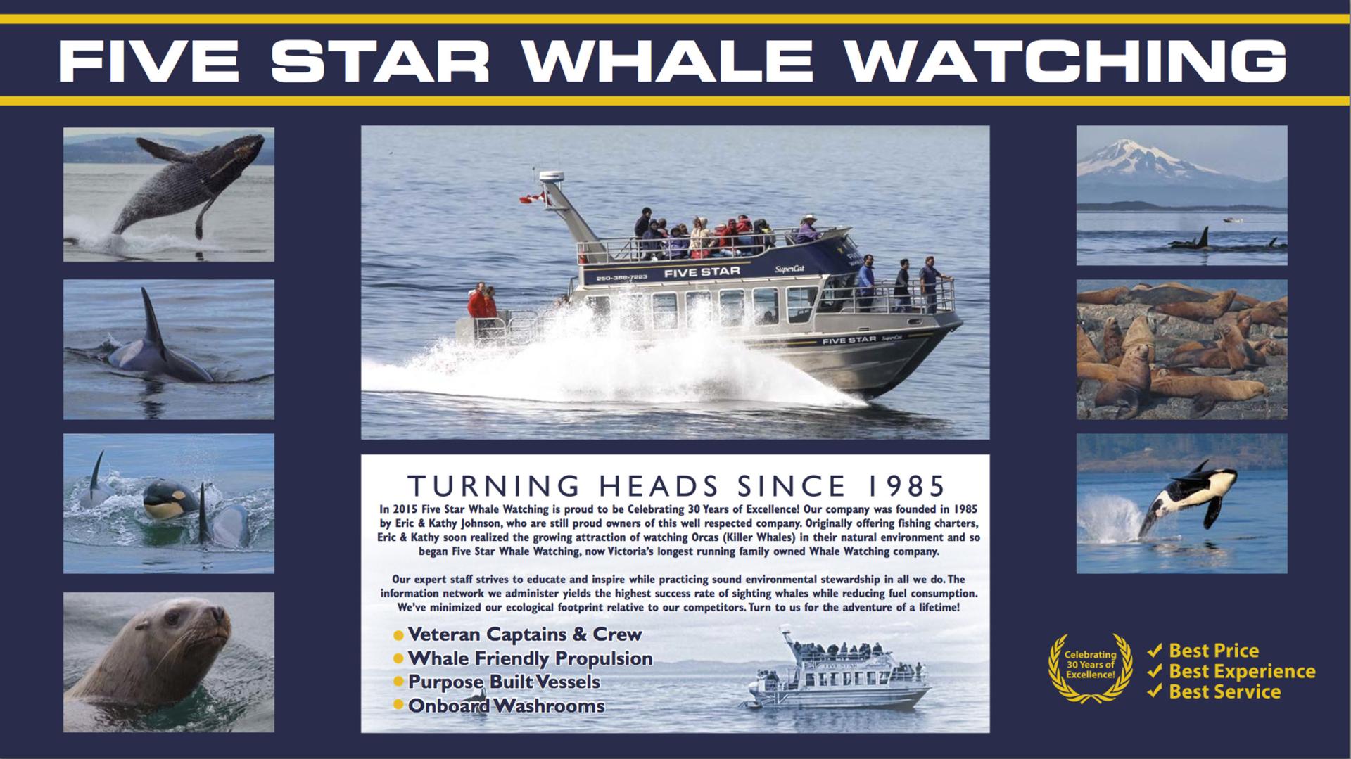 Join Five Star Whale Watching for the adventure of a lifetime – an experience that you will never forget! As Victoria’s longest running family owned and operated whale watching company and first Catamaran company, we have built up Victoria as a world class destination for whale watching. Setting the bar high for the local whale watching industry we have been inspiring and educating guests since 1985, introducing them to the wonders of the Salish Sea and our resident Orca whales.